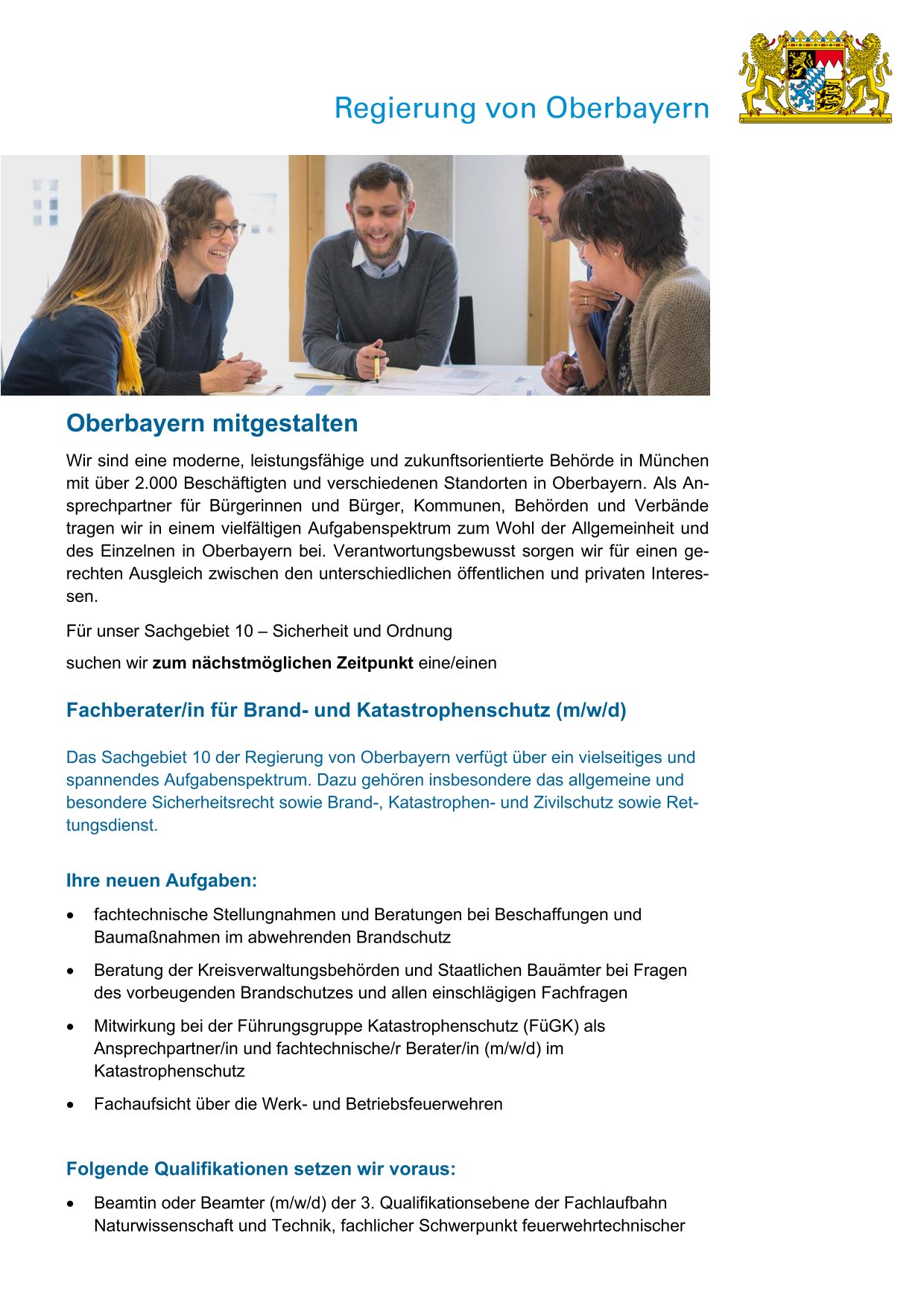 Auftragsdetail: Fachberater/in für Brand- und Katastrophenschutz (m/w/d) an der Regierung von Oberbayern